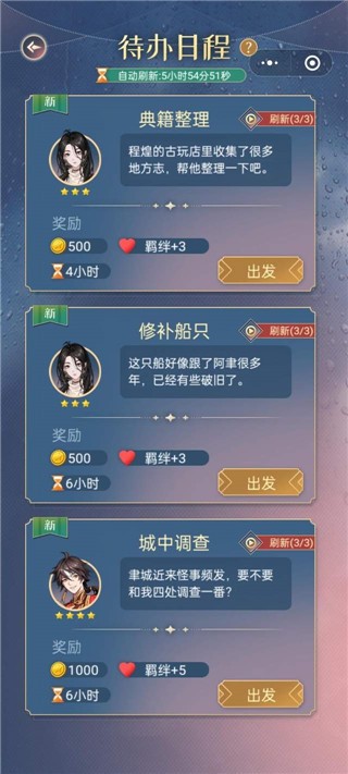 嫌拜访和直接提升速度太慢?不着急,我们还有办法:返回“聿城”界面,点击“日程”,解锁和男主们的共同出行~选择“出发”后,就能选择四位男主中的一位和你同行。注意仔细看任务提示,要选择最合适的男主,才能加最多的羁绊值哦~