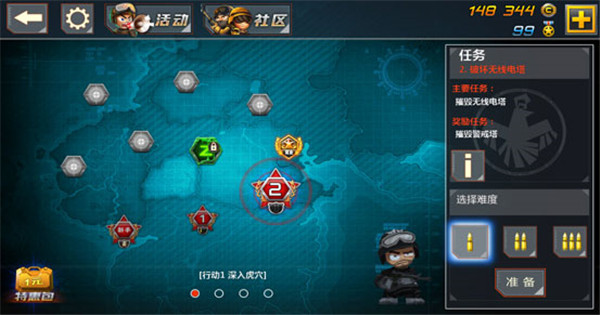 进入人物选择界面以后,能看到很多的图标,左上角有返回键和设置键,返回是返回游戏初始画面,设置键是设置音效和游戏画质的。右上角有显示自己的命令点数和勋章数,命令点和勋章都可以用来升级武器防具,购买更多人物或者装备等,其获得的方式可以从游戏里捡得,也可以在右边的商城里面购买。中间就是武器,装备,人物添加的图标了,在这里可以升级武器,装备,和给队伍添加新的兵种。最后的右下角是进入游戏的按钮。