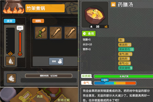 特点:拥有肺和心,以及温热和寒凉,还有须臾灵巧和清明。煮3份一并喝下可以获得相当的加成。30层的须臾XX也有相当不错的持续时间。