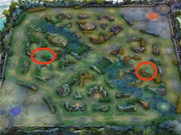 在20分巨人还没到中路时,自家有蓝buff可以提前蹲草,无蓝buff就到对方蓝区蹲草(红圈处位置)