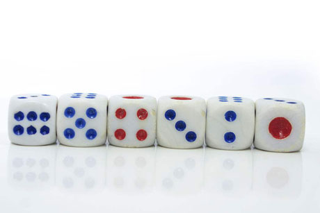 一种立体小方块造型的器具,有六个面分别刻有1到6点,其中1点和4点是红色,其余点数均为黑色,也可称之为“骰子”,在每局开始前由庄家投掷,根据点数确定开牌位置。