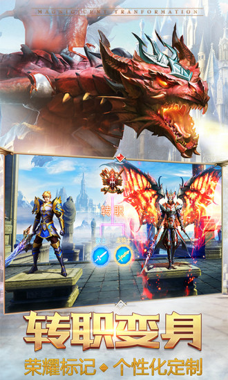 1、转职变身,专属荣耀个性造型 针对个性玩家打造特色系统,你可以自由转职变身,不受职业限制,同时获得专属巅峰标记,炫酷大招及个性造型,荣耀无比。